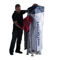 Das Konzept für den Aufbau des Mastertent®-Zeltes ist überzeugend: Einfach, schnell und ohne Werkzeug muss es gehen. Wir liefern ein kompaktes Paket. Darin steckt das gesamte Zelt, sorgsam gefaltet, zusammengeklappt und geschützt. Durch das Auseinanderziehen des Zeltes öffnet sich die Struktur, und das bereits vormontierte Dach wird automatisch gespannt. Anschließend werden die Füße auf die gewünschte Höhe ausgefahren. In nur einer Minute steht Ihr komplettes Mastertent®-Zelt!