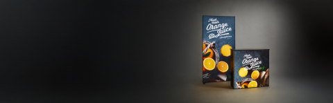 Leuchtende Messetheke Expolinc Light Frame Counter mit bedruckter Frontgrafik „Fresh made Orange Juice“ und Orangenmotiv auf dunklem Hintergrund