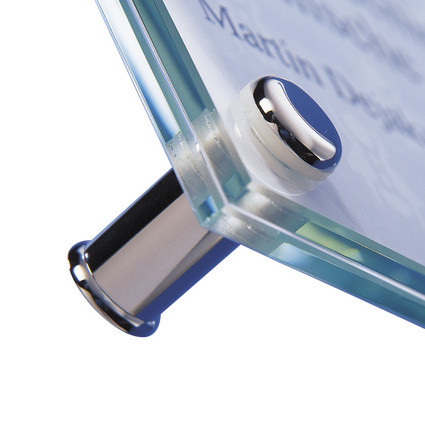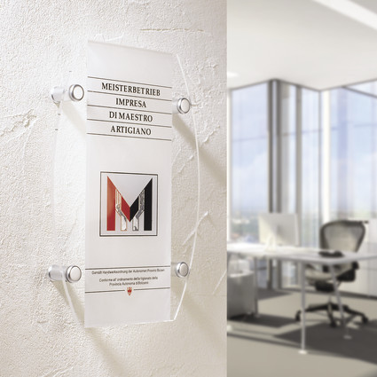 Stecksystem mit Arretierung für mittlere Formate. Halter an der Wand befestigen, Paneel auflegen, Kopf durch das Paneel in den Halter stecken und mit seitlicher Madenschraube im Halter gegen Manipulation sichern. Für Schilder, Platten, Paneele und Borde mittlerer Stärke. Ø15mm