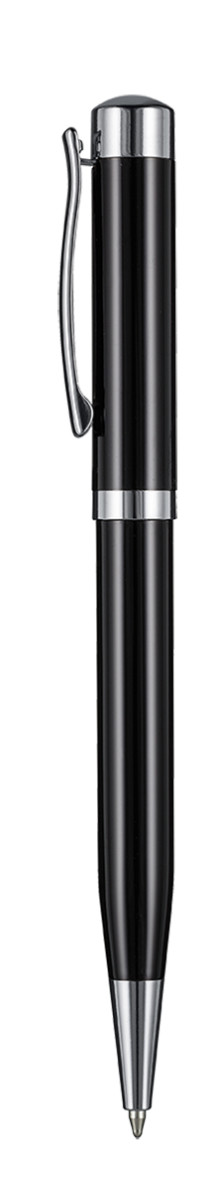 Zeitlos eleganter Metallkugelschreiber mit Drehmechanik, verpackt im schwarzen Papp-Etui Pen-Box. Schaft und Kappe sind schwarz glanzlackiert mit glänzender Chromunterlegung für beeindruckende...