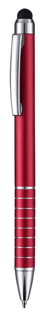 Metallkugelschreiber mit Drehmechanik mit matt-rotem Metallschaft und glänzenden Applikationen. Blau-schreibende Mine. Zusatzfunktion: Gummikappe zur Bedienung von Smartphones, Tablet PCs etc.