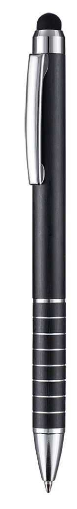 Metallkugelschreiber mit Drehmechanik mit matt-schwarzem Metallschaft und glänzenden Applikationen. Blau-schreibende Mine. Zusatzfunktion: Gummikappe zur Bedienung von Smartphones, Tablet PCs etc.