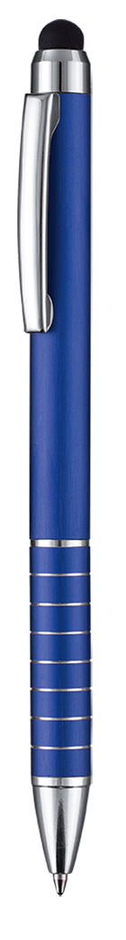 Metallkugelschreiber mit Drehmechanik mit matt-blauem Metallschaft und glänzenden Applikationen. Blau-schreibende Mine. Zusatzfunktion: Gummikappe zur Bedienung von Smartphones, Tablet PCs etc.