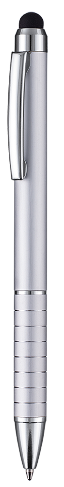 Metallkugelschreiber mit Drehmechanik mit matt-silbernem Metallschaft und glänzenden Applikationen. Blau-schreibende Mine. Zusatzfunktion: Gummikappe zur Bedienung von Smartphones, Tablet PCs etc.